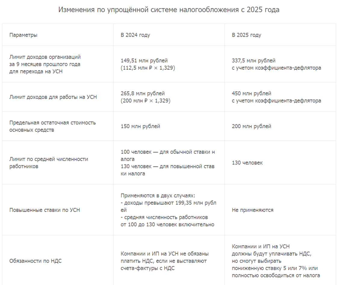 С 2025 года предприятия и индивидуальные предприниматели, использующие упрощённую систему налогообложения, смогут получать доход до 450 миллионов рублей в год. Порог остаточной стоимости основных средств увеличится с 150 до 200 миллионов рублей. Кроме того, упрощённая система налогообложения станет обязательной для предприятий с годовым оборотом более 60 миллионов рублей. Эти изменения предусмотрены законопроектом № 639663-8, внесённым правительством в Государственную Думу.