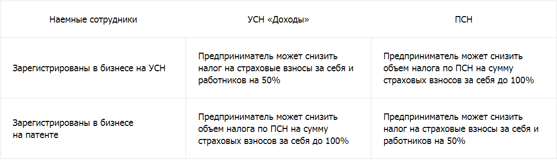 Применение упрощённой системы налогообложения (УСН) и патентной системы налогообложения (ПСН) позволяет предприятиям снижать налоговые обязательства на сумму уплаченных страховых взносов. Если у предпринимателя нет наёмных работников, размер страховых взносов можно сократить до нуля. В противном случае выплаты можно уменьшить на 50 % для самого предпринимателя и сотрудников.